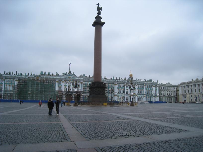 この広場の中心に立っている「アレクサンドルの円柱」は地面になにも打ちつけず、広場に置いてあるだけの状態で、そのため万一円柱が倒れても被害がないように、広場の円周は円柱の高さより広く作ってあります。この円柱は、ナポレオンとの戦争の勝利を記念して造られたもので、高さは47,5mにも及びます。