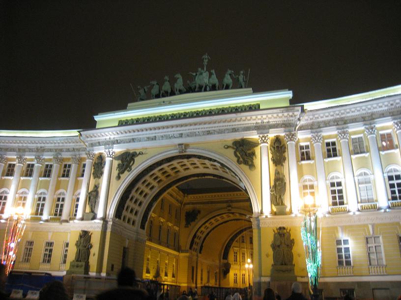 そして、南側にあるのが旧参謀本部で広場を半円形に囲んでいます。また広場とネフスキー大道通りをつなぐ通りをまたいで凱旋門も作られています。この上部には馬車に乗った勝利の女神像が建っておりこれも、ナポレオンとの戦争に勝利した事を記念したものです。